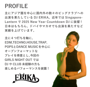 国内外で活躍するDJ ERIKAさんが登場します!日本はもちろん、シンガポールやドバイ、マカオなどでも出演経験のある人気DJ。GIRLS NIGHT OUTではDJやCLUB未経験の方でも楽しめるようなパフォーマンスを披露してくれます。