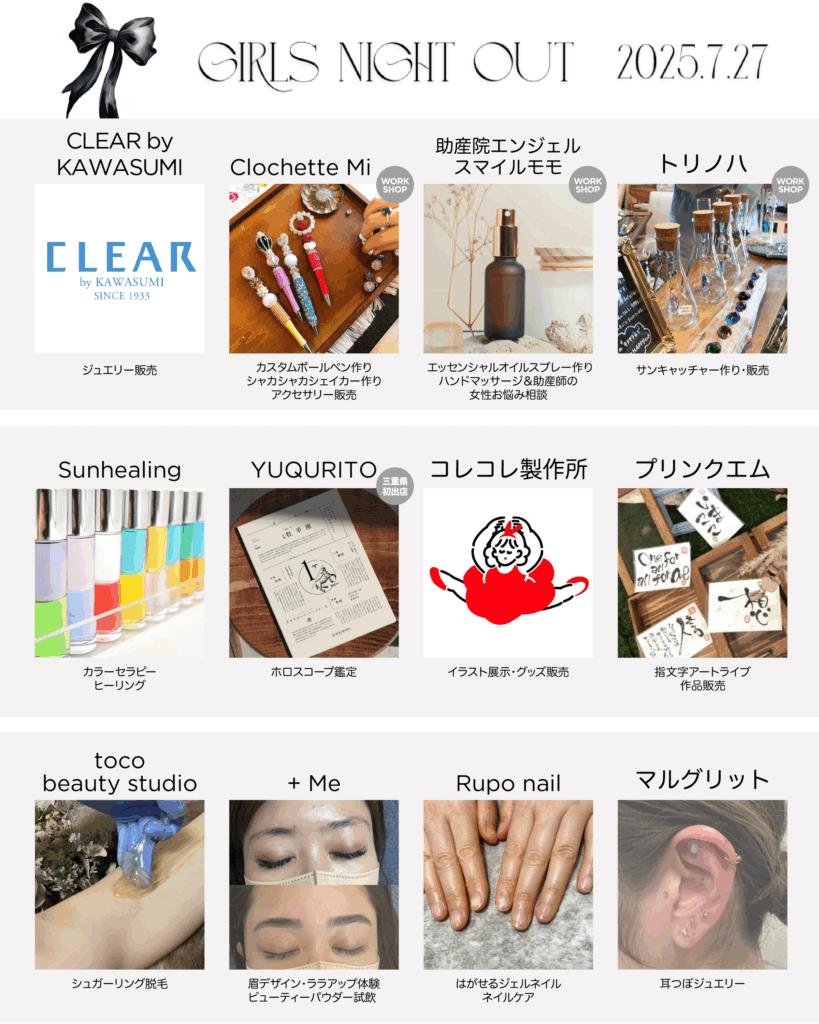 “キレイ”と“癒し”がテーマの、女子力アップブースがいっぱい!ビューティー体験(ネイル・眉デザイン・耳つぼジュエリー)から、心のケア(カラーセラピー・ヒーリング・ホロスコープ鑑定)まで充実。さらに、ハンドメイドアクセサリーやアート作品の販売、サンキャッチャー&アロマクラフトのワークショップなど、感性を刺激する体験をたくさんご用意しています。