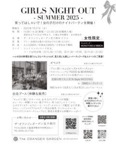 IXホールディングス株式会社(本社:三重県伊勢市)のグループ会社である、オランジェ株式会社(本社:三重県伊勢市、代表取締役社長 小河満美子)は、2025年7月27日にザ・オランジェガーデン五十鈴川にて、女性限定イベント「GIRLS NIGHT OUT」を伊勢で初開催します。特別ゲストに国内外で活躍するDJ ERIKA氏が登場し、三重での初パフォーマンスを行います。
